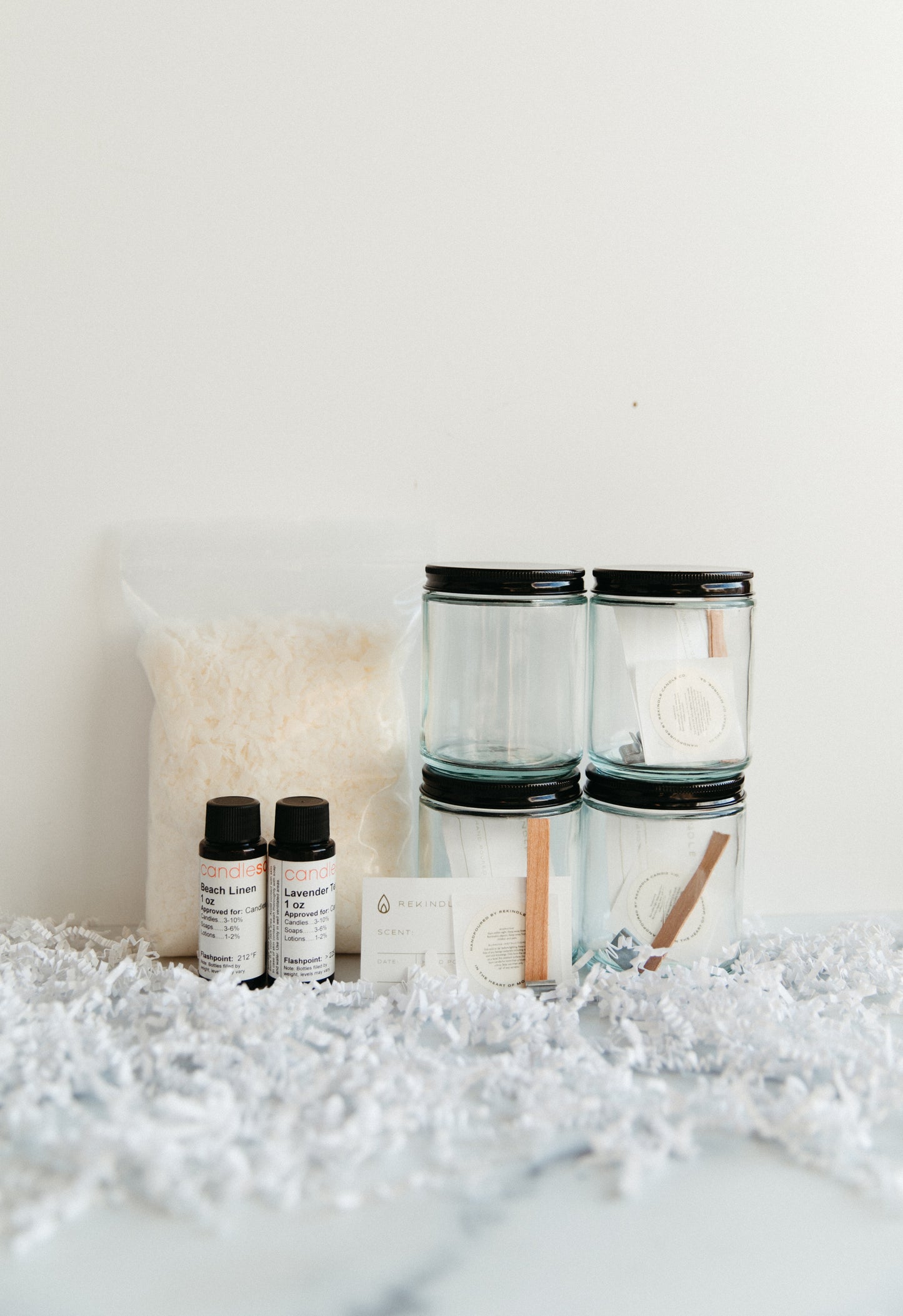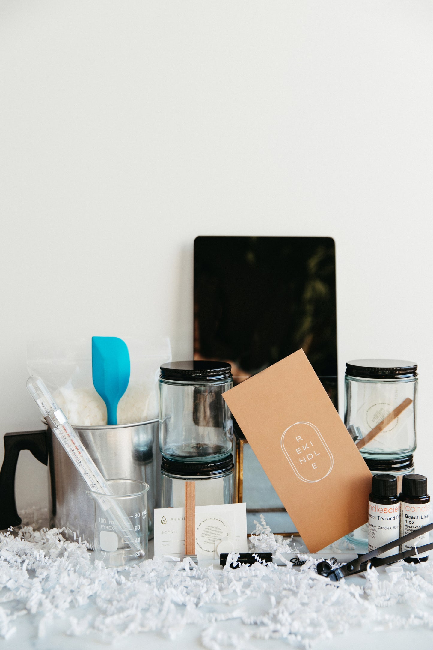 Our Premium Kit comes with everything in our Standard Candlemaking Kit as well as two extra jars with necessary materials such as wicks, an extra bag of wax, an extra bottle of fragrance oil, a scale for weighing your oil and wax, and a thermometer.