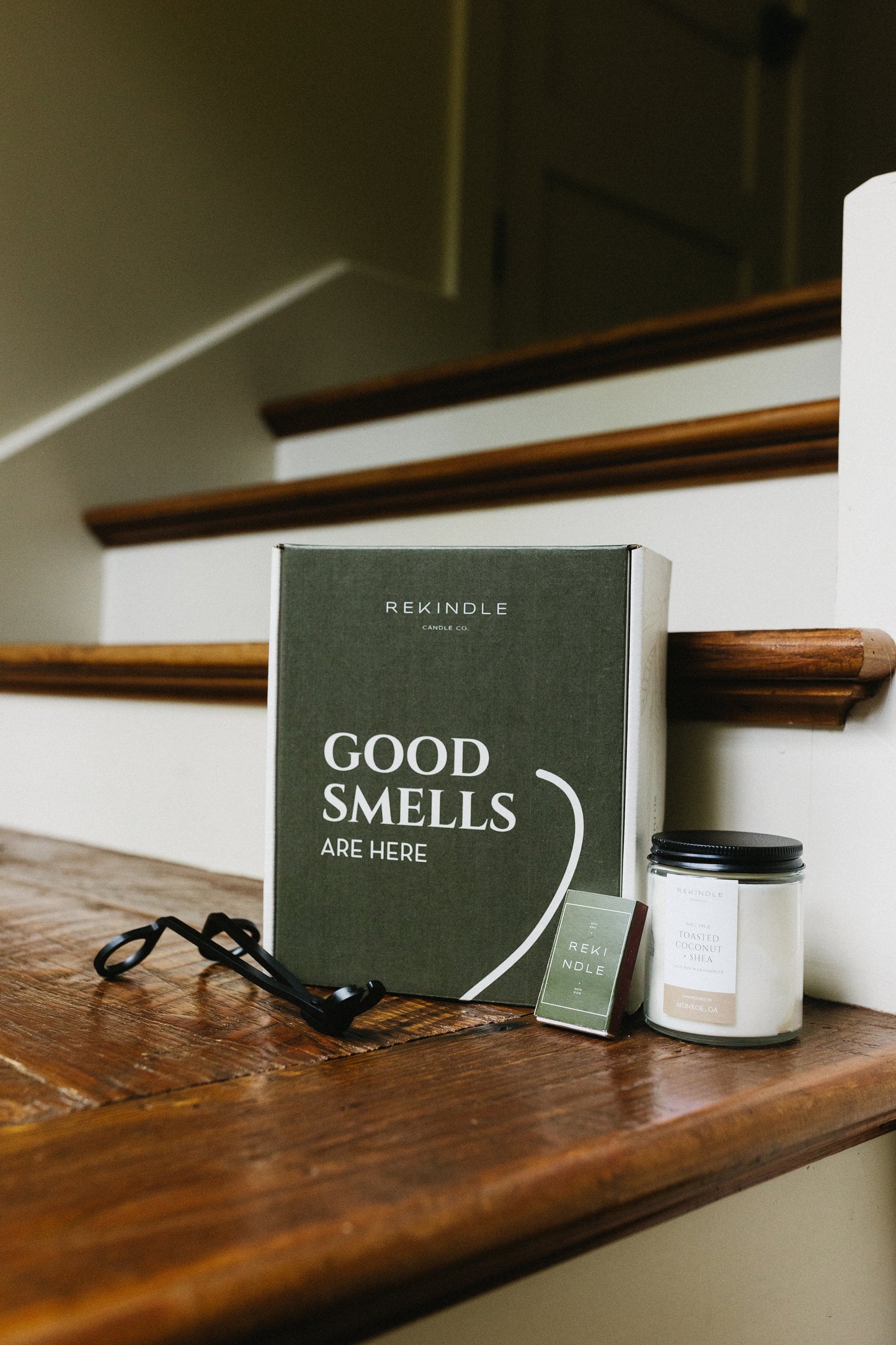 A monthly candle subscription box. Contains one 5oz. soy candle and box of matches. Each month will feature an exclusive scent that you can't find anywhere else and will reflect the season of the year we're in.