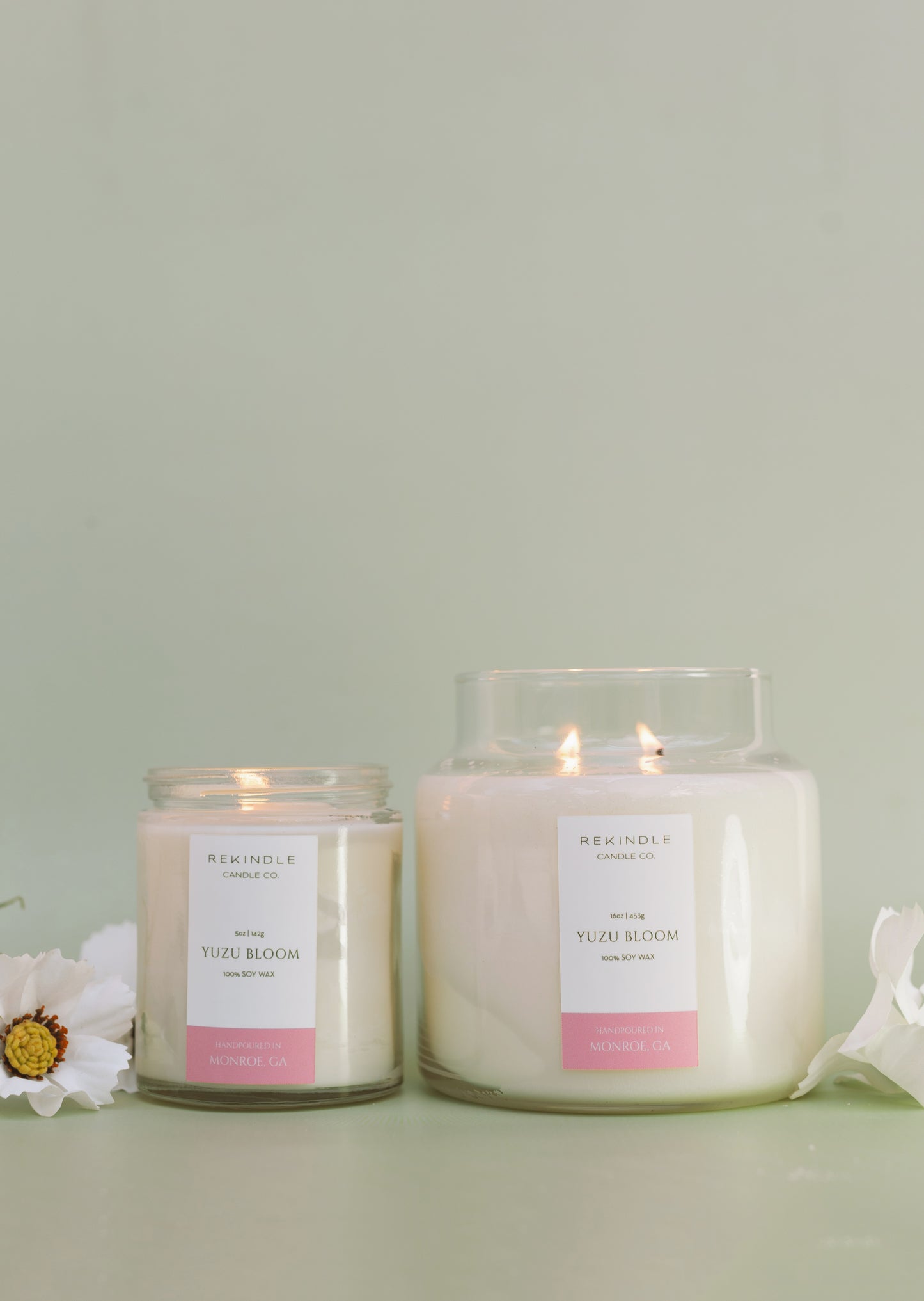 Fragrance Description: Our newest addition to our Spring lineup. Yuzu Bloom opens up with soft yet vibrant notes of citrus fruits with a bridge of invigorating yuzu and jasmine florals and wrapped up with a bow on top of clean bamboo and sea salt. A bright, yet soft blend of florals, fruits, and clean linen-type neutrals.